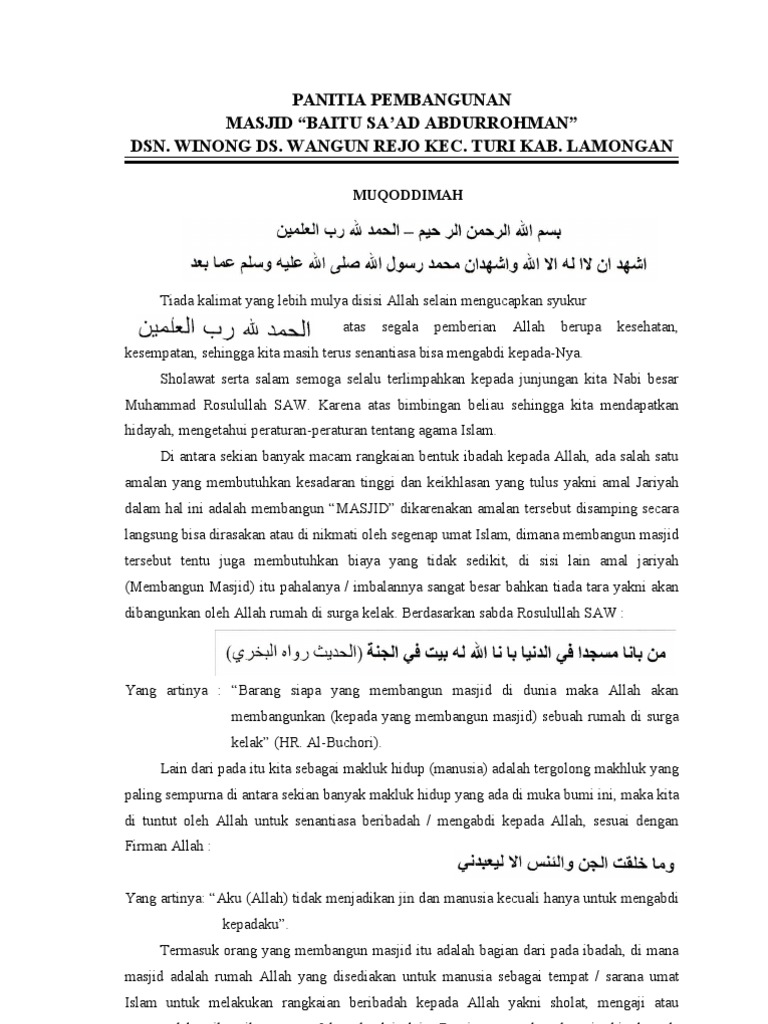 Proposal pembangunan masjid al fattah2 pdf articles news stories doc proposal panitia pembangunan masjid nurul akmal tahun 2018 proposal pembangunan masjid untuk pembangun masjid ar rabbani di selamat datang di sma negeri 2 boyolali begini jadinya request of proposal pembangunan masjid rendy. Panitia pembangunan masjid baiturrahman permata arcadia Pembangunan mental atau rohani susah untuk diukur karena bersifat kasat mata. 14 year kelurahan rampal celaket kecamatan klojen malang telp. 07 desa jingkang * 53163.