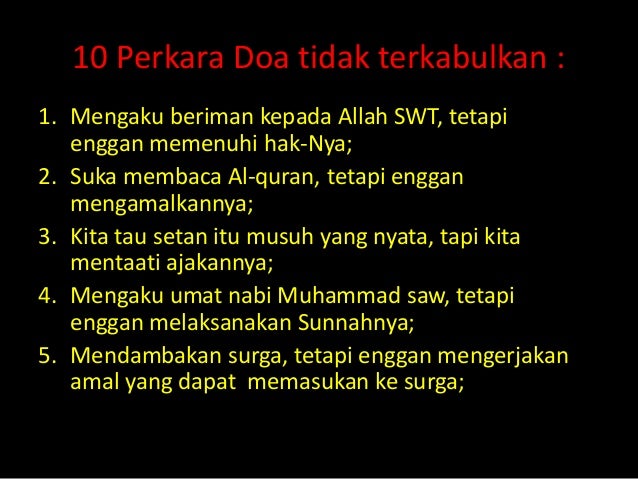 Pernyataan di bawah ini kemungkinan belum dikabulkannya doa tersebut, kecuali. Ada kemungkinan sebenarnya doa yang kita panjatkan keharibaan allah swt bukanlah tidak dikabulkan, melainkan hanya sedang ditunda oleh allah swt. Ditangguhkan sampai di akhirat d. Tidak semua doa yang dipanjatkan dikabulkan oleh allah swt. Sebab doa bukanlah sebuah hukuman, dan orang tidak dihukum karena berdoa, malah allah menganjurkan kita untuk berdoa padanya.